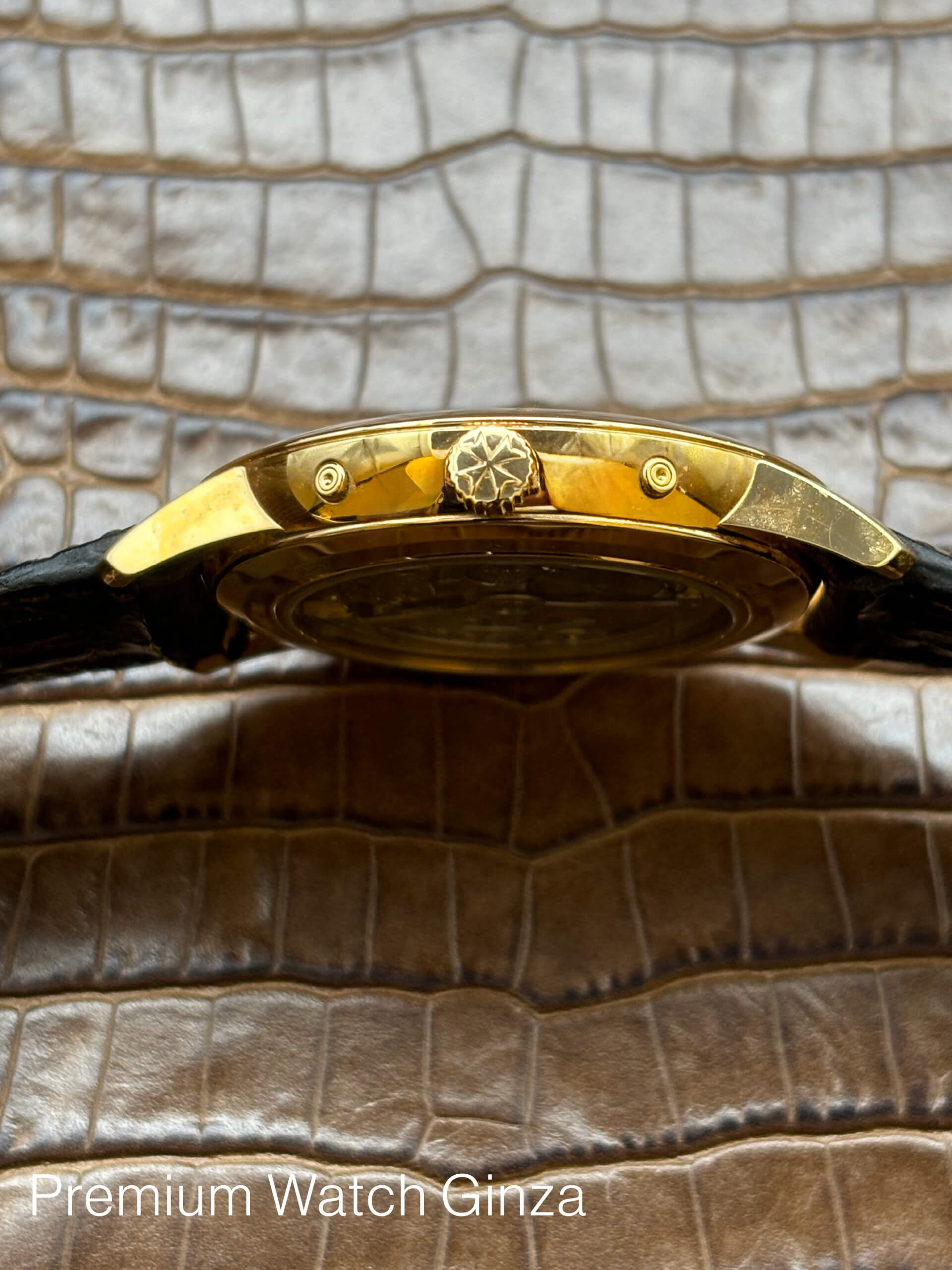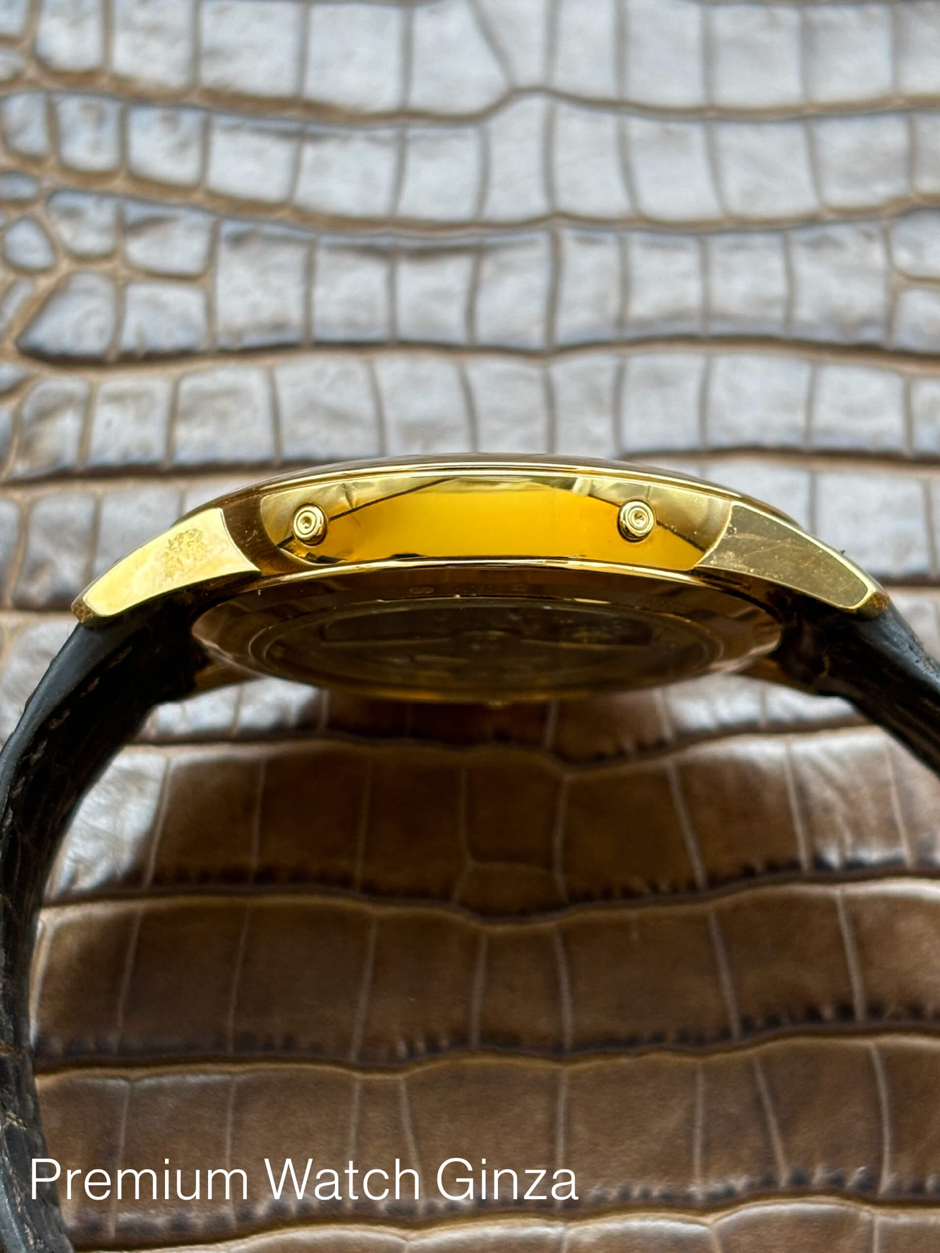 外装は全面鏡面仕上げで、パトリモニーの特徴である幅の狭いベゼルの為、文字盤面積が広くなり、実寸以上に着用時の存在感が出ます。文字盤外周の毎分、毎秒を示すK18ゴールドのドットが光に反射し美しく時計全体を際立たせる贅沢な1本でございます。