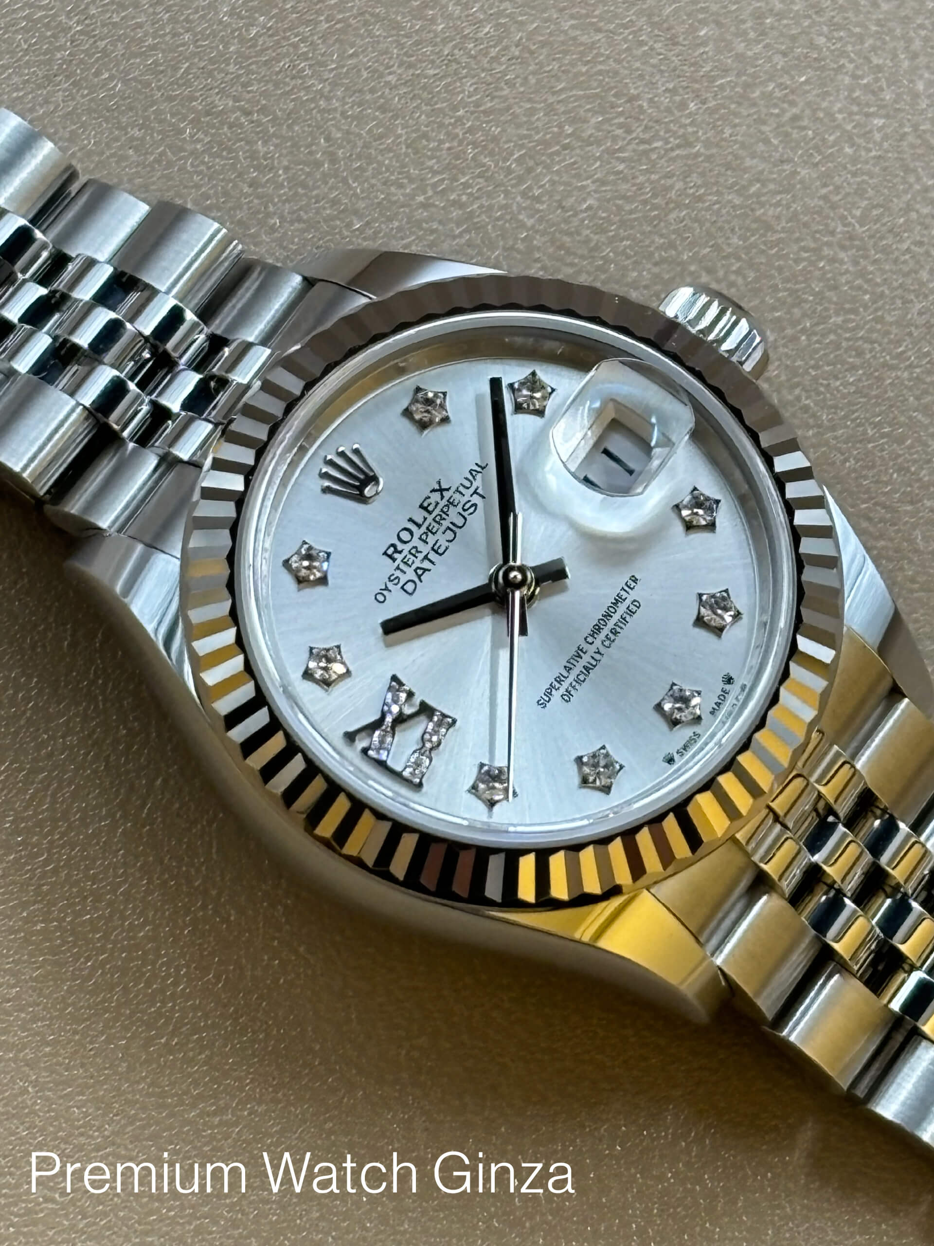 そして、こちらの現行機種Ref.279174のシルバー文字盤に採用された10ポイントのセッティングダイヤモンドで、星形にカッティングされた9箇所のセッティングと9時位置のK18ゴールド製ローマンインデックスに8個のダイヤモンドをセッティングされた可愛らしく、遊び心の有るユニークな文字盤でございます。
